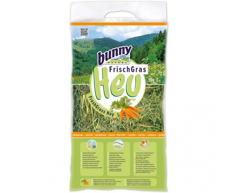 La miscela di Fieno Fresco dell' Algovia e carote rappresenta la prima scelta per un 'alimentazione ottimale di conigli e roditori.